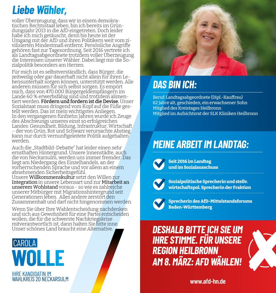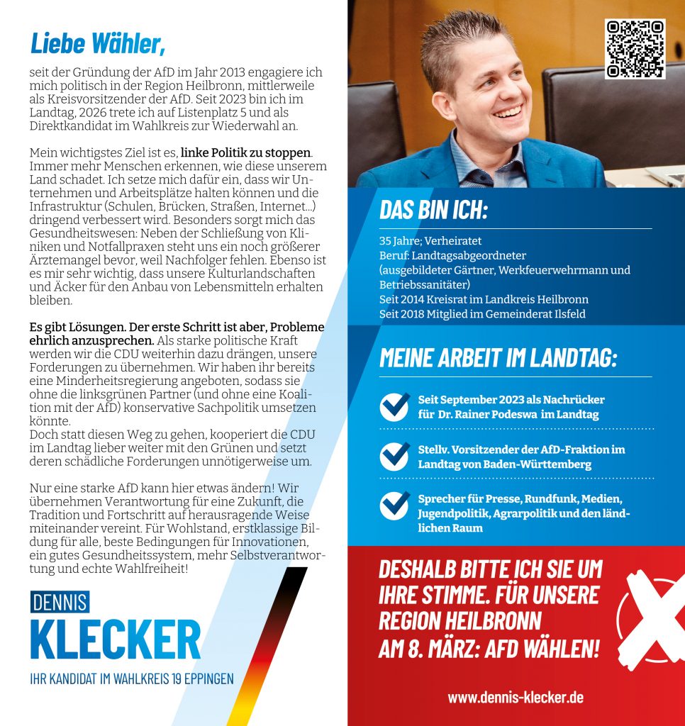 Weitere Informationen zur Landtagswahl finden Sie auch bei unserem Landesverband. Informationen zum Wahlkampfauftakt der AfD Baden-Württemberg in der Heilbronner Harmonie finden Sie hier – einen Livestream bzw. eine Aufzeichnung der Veranstaltung finden Sie hier.